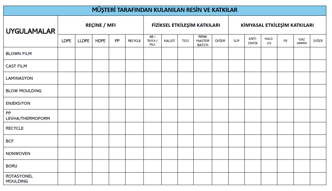Fayda maliyet açısıdan en optimize olan ürünü, sizin beklentileriniz ve işletmenizin dinamikleri doğrultusunda tavsiyede bulunuyoruz İşletmeniniz Makine parkını en verimli ve ürün içeriğiniz en etkili şekilde olması için size özel çözümler sunuyoruz. Sıcaklık ve basınç koşulları, kalıp ağzı gibi Makine parametrelerinize vabeste geniş ürün portföyümüzde doğru ve etkili ürün kullanımınıza yönelik yardımcı oluyoruz. Geniş ürün portföyümüzde yer alan ürünlerden doğru ürünü, doğru uygulamaya ve doğru içeriğe vermek adına reçinenizde ki etkileşimleri göz önünde bulundurarak tavsiyelerde bulunuyoruz.
